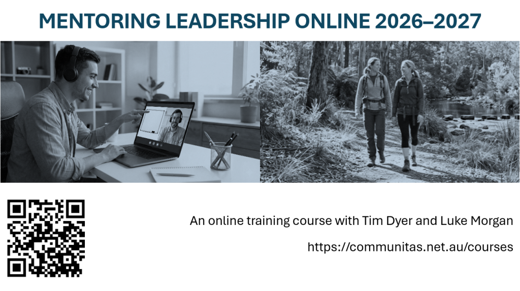 Tim and I are offering Mentoring Leadership Online in 2026-2027. The course provides the environment for thoughtful Christians and leaders to reflect on their experience and to develop skills to intentionally build into the lives of others. The training involves six online workshops and at least ten 60-90 minute practice sessions in triads with other course participants each year. Trainee mentors are expected to actively seek mentoring relationships and engage their own personal mentor after the first workshop.